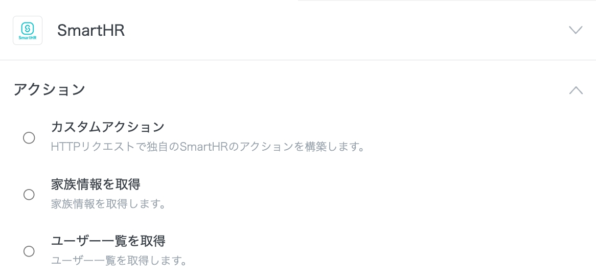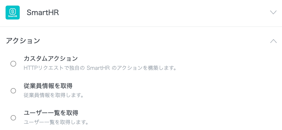 SmartHR APIドキュメントに記載の仕様に則ってアクションを行うことができます。