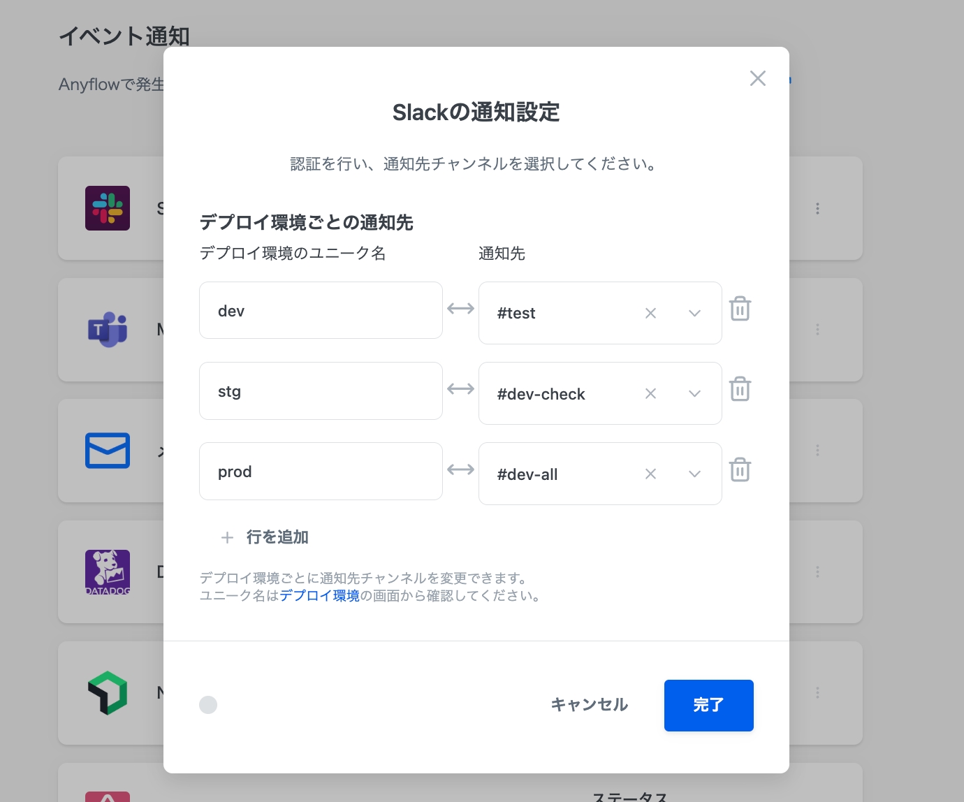 この設定で指定していないデプロイ環境でイベントが発生した場合は、デフォルトの通知先に通知されます。