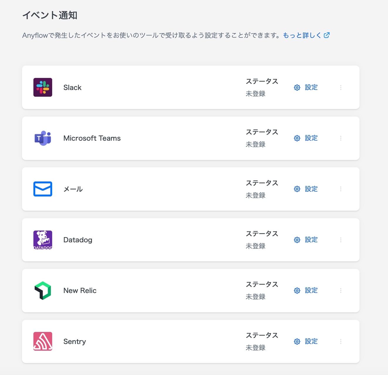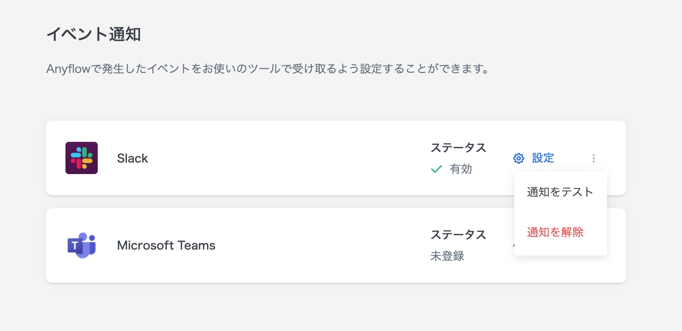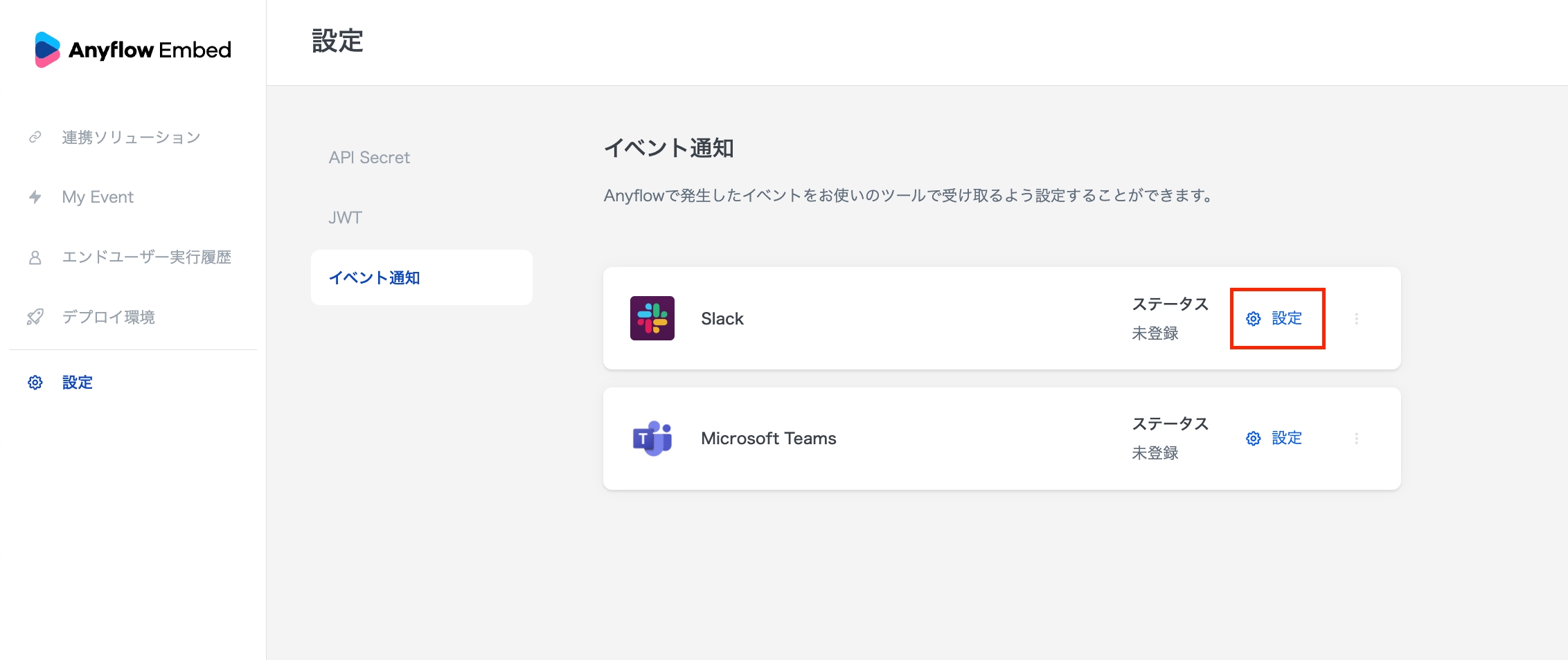 Anyflow Embed の管理画面にて 設定 > イベント通知 を開きます。