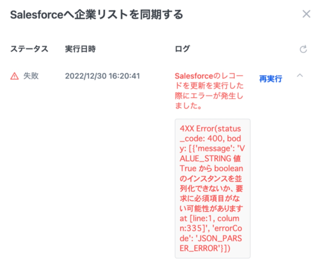 エラーが発生した場合には、エラーの内容がログとして表示されます。