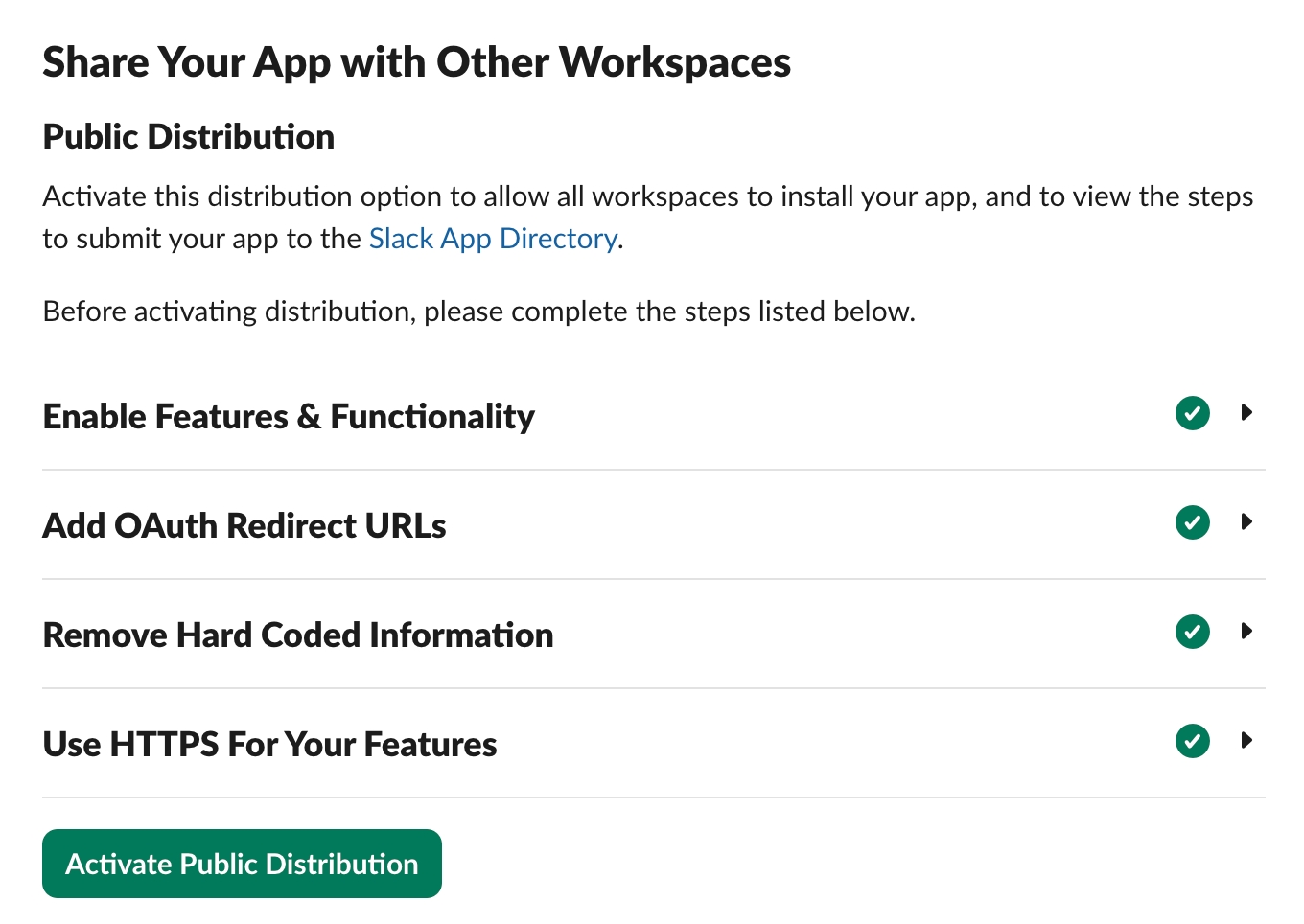 下にスクロールし、「Share Your App with Other Workspaces」のセクションに進みます。 4つの条件が全てクリアされていると、「Active Public Distribution」のボタンが有効になります。