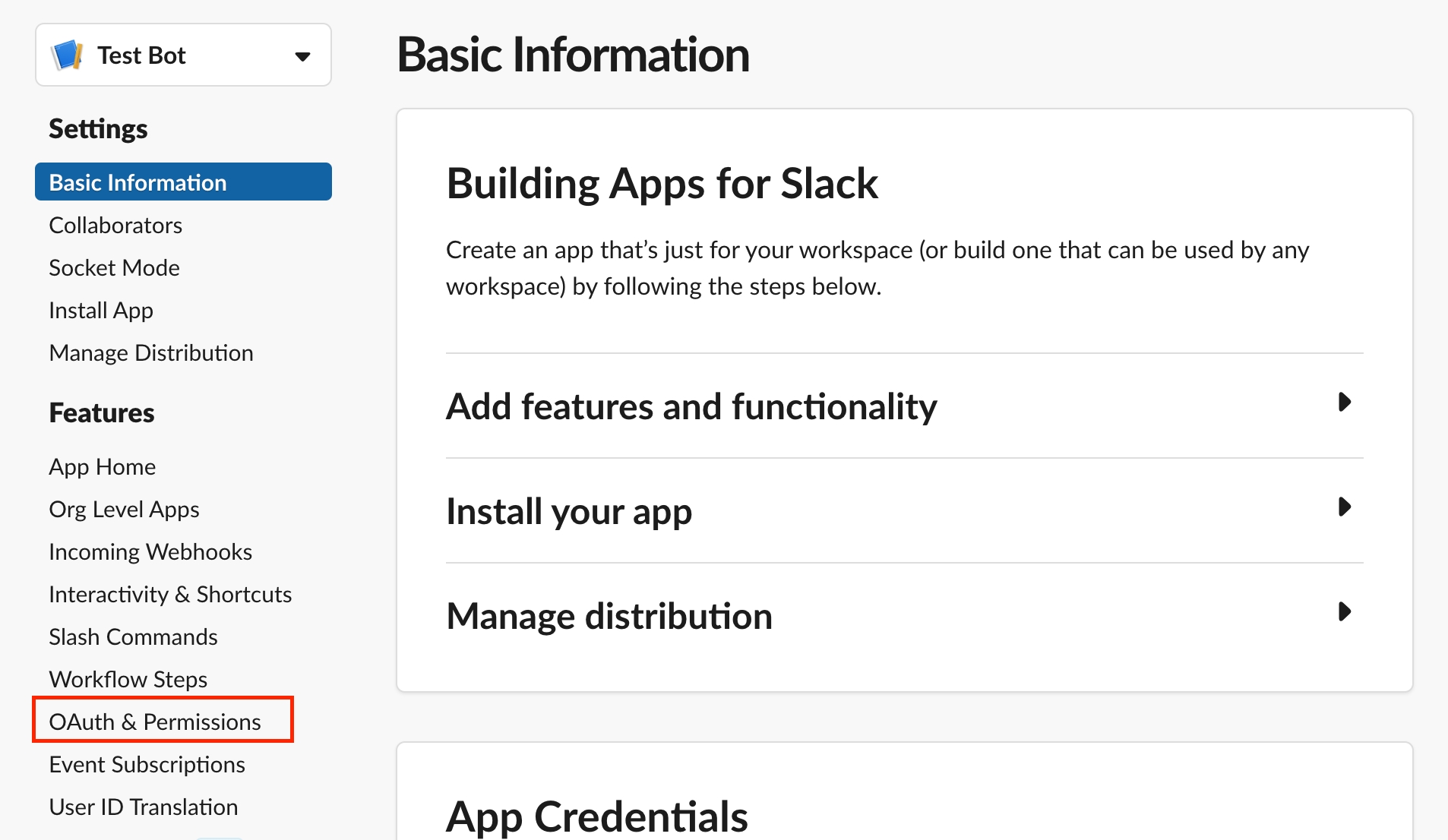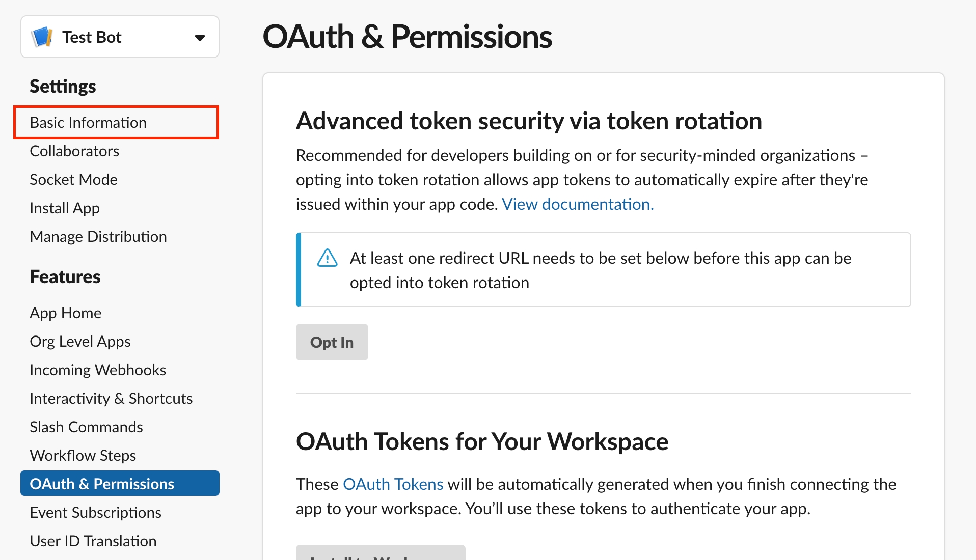 左メニューから、OAuth & Permissions を選択します。