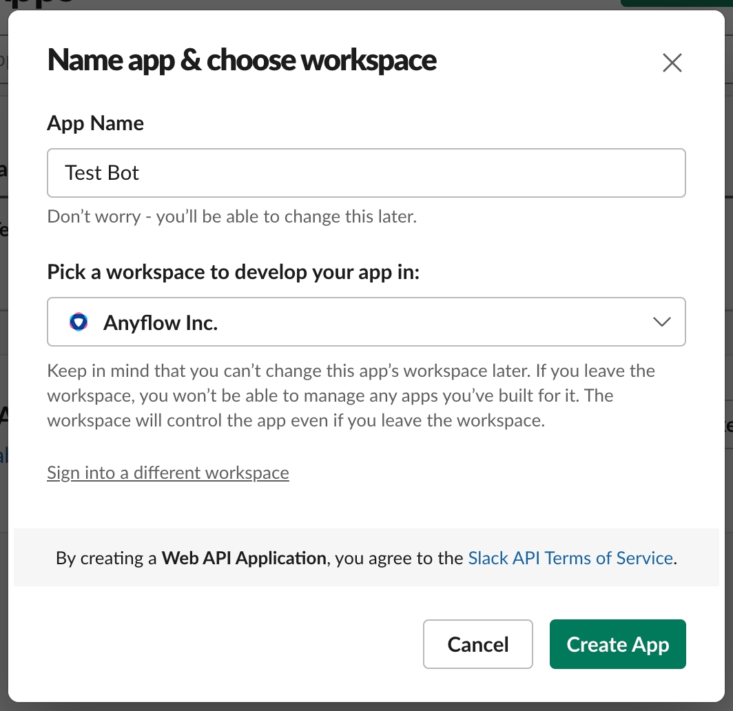 App Name, workspace を設定し、Create App を選択します。