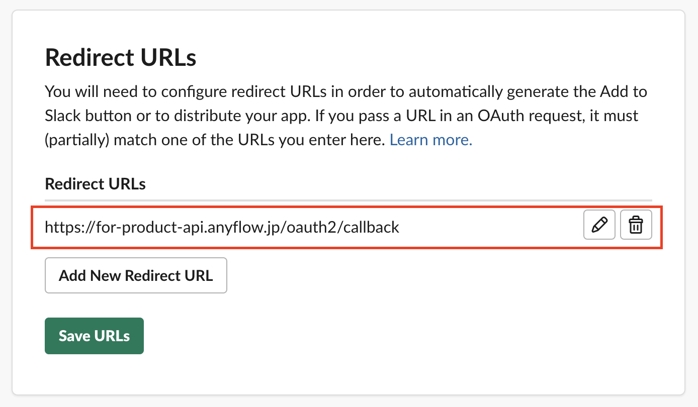Redirect URLS の欄で以下のコールバックURLを追加し、Save URLs を押します。