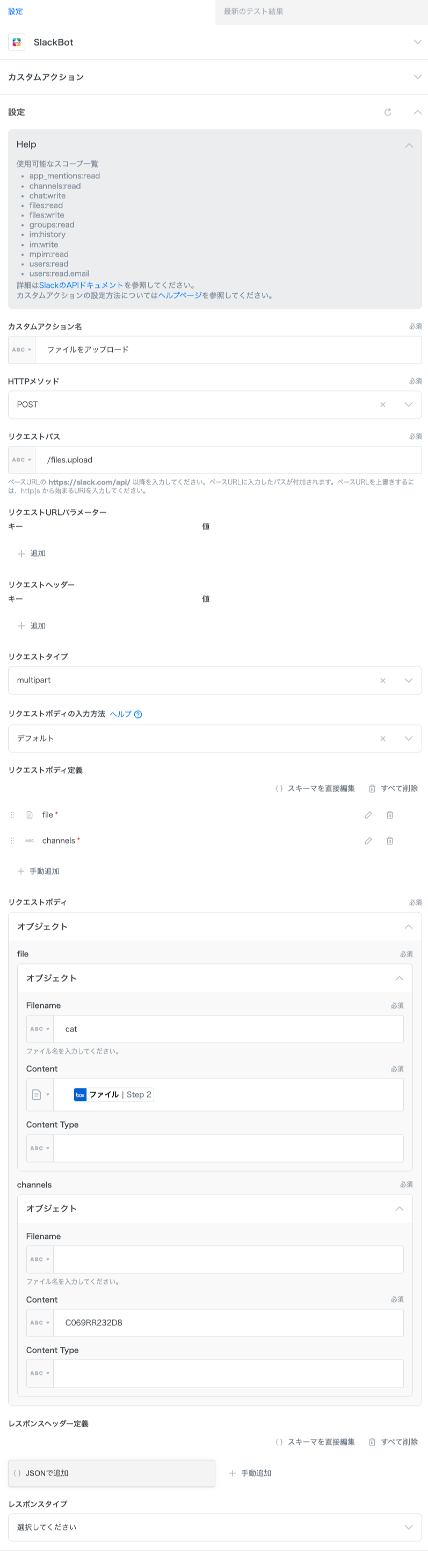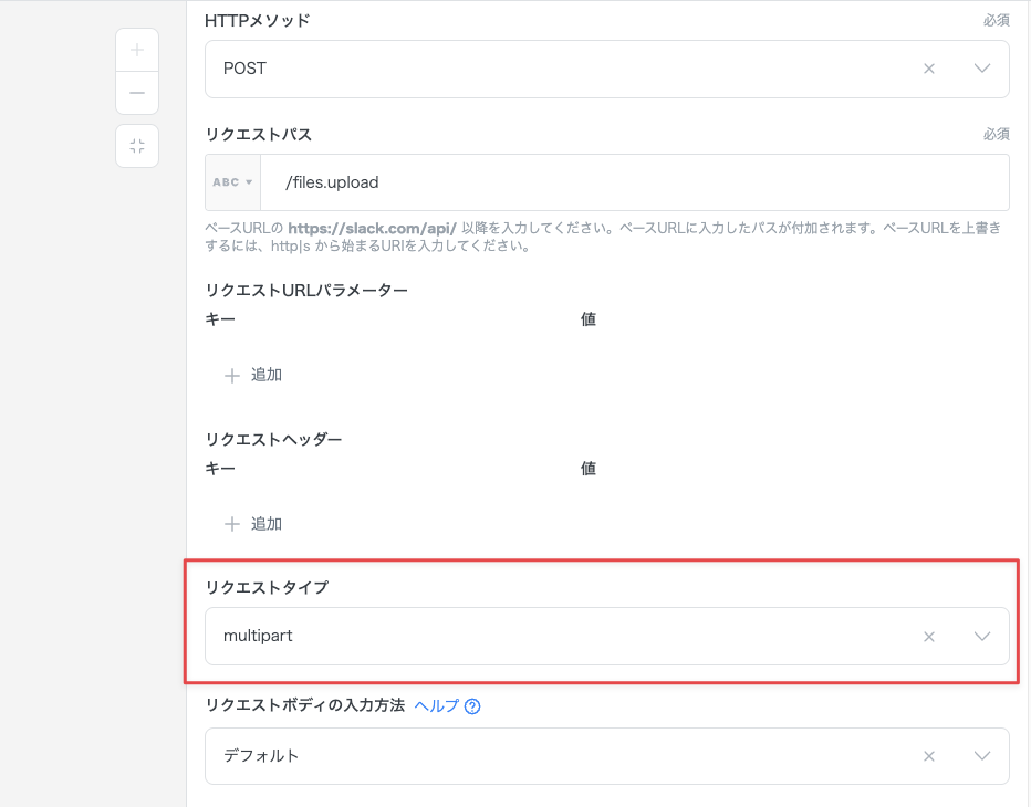 リクエストタイプには multipart と入力します。Slack の特定チャンネルにファイルをアップロードするにためには、この設定が必須となります。
