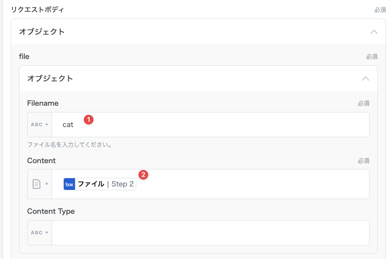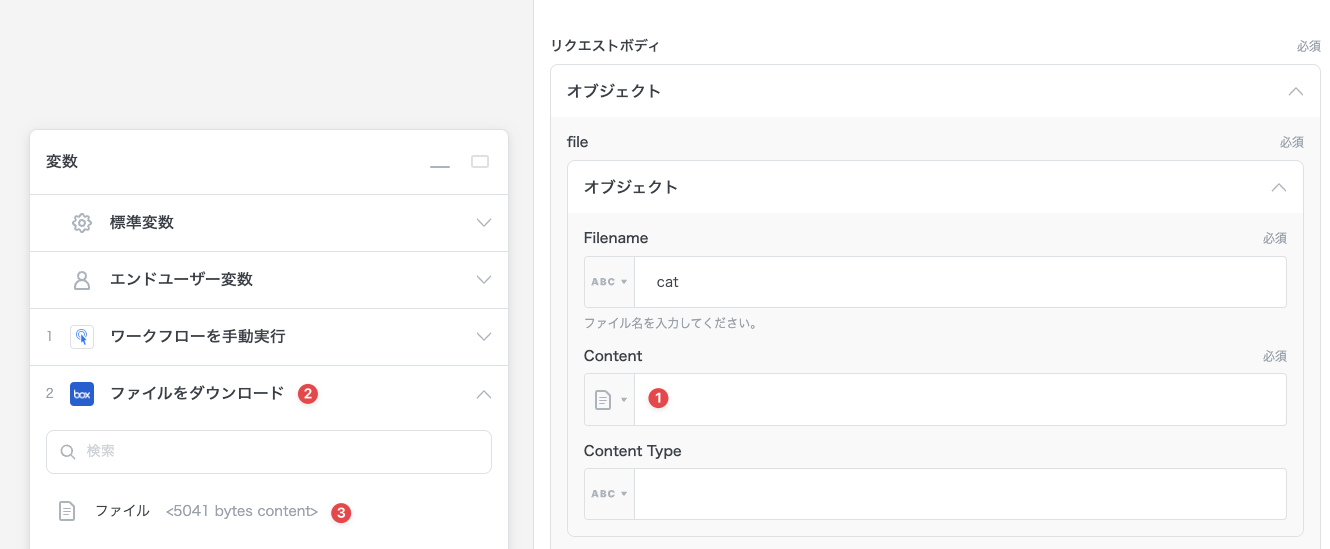 Content に、事前準備で作成した「ファイルをダウンロード」アクションによって提供される変数を指定します。Content をクリックし、変数欄から「ファイルをアップロード」→「ファイル」の順番に選択します。