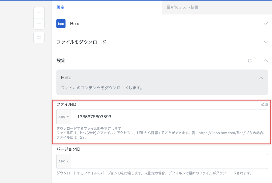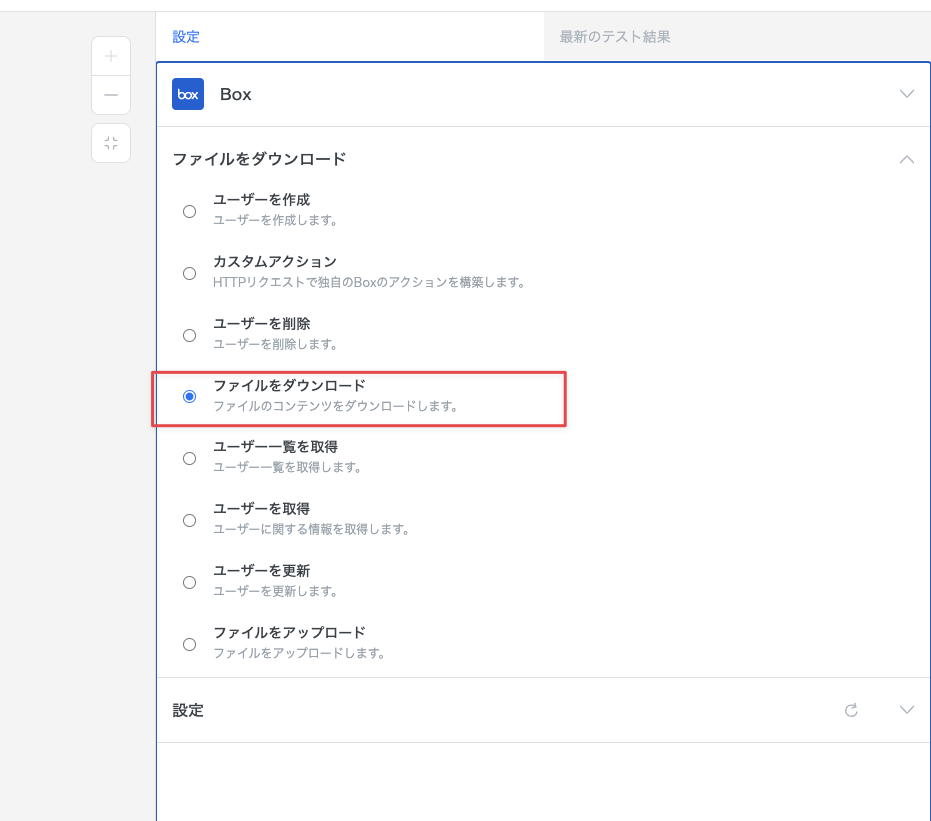 クラウドストレージサービスから、ファイルをダウンロードするアクションを追加します。本レシピでは Box の「ファイルをダウンロード」アクションを利用する例を解説します。