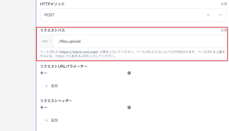 リクエストパスには /files.upload と入力します。
