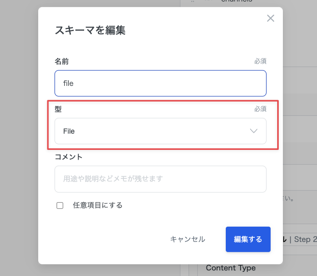 fileスキーマは以下のように設定します。型には File を指定します。