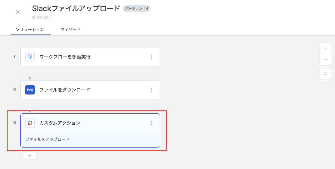 先に構築した「ファイルをダウンロード」アクションによってダウンロードしたファイルを、Slack のチャンネルにアップロードするカスタムアクションを構築する手順を解説します。