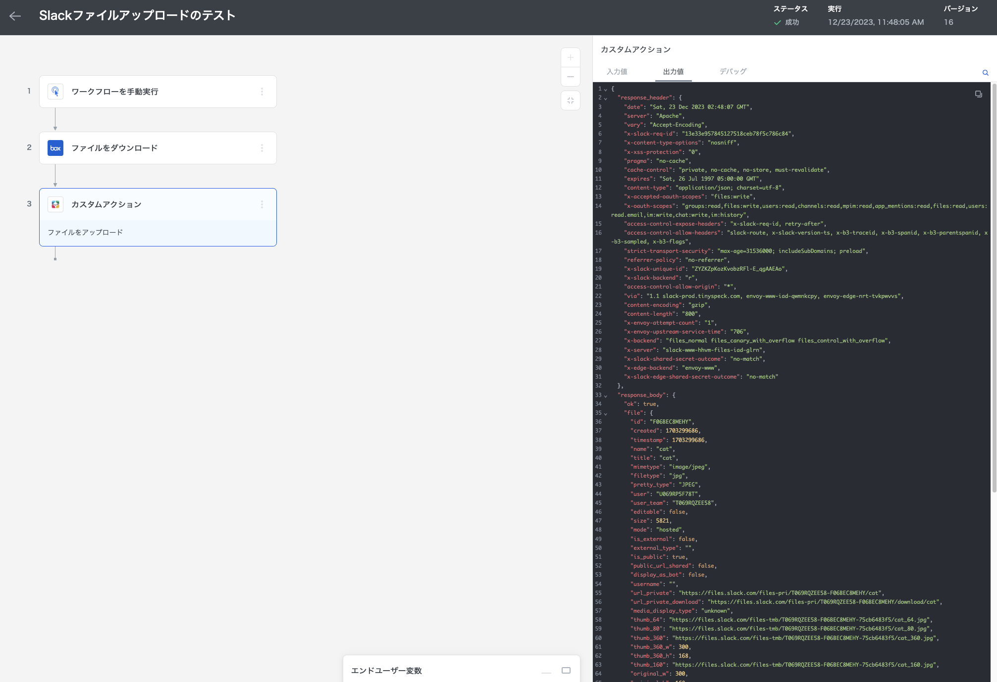 これで Slack にファイルをアップロードするカスタムアクションが完成したので、テストを実行してみましょう。