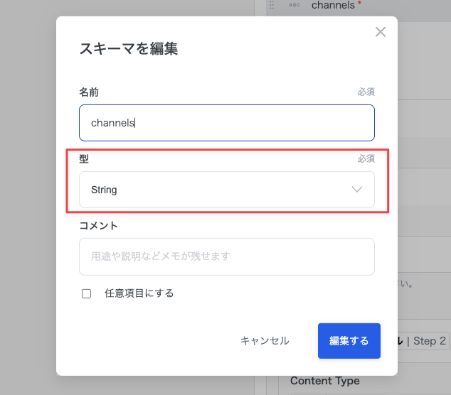 channelsスキーマは以下のように設定します。型は String を指定します。