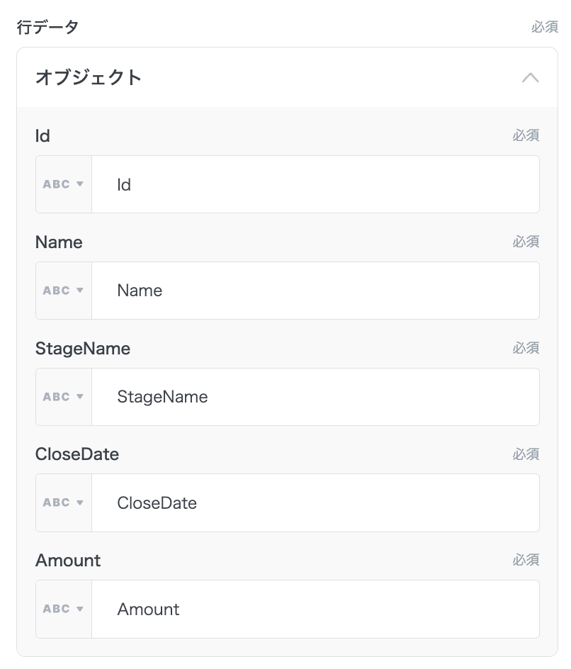 このレシピは、Opportunity | Salesforce プラットフォームのオブジェクトリファレンス | Salesforce Developers を参考に記述されています。