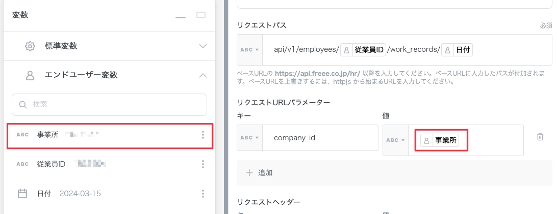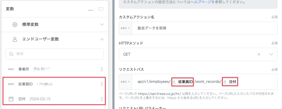 「リクエストパス」には以下の設定を行います。エンドユーザー変数から「従業員ID」「日付」を選択し、パスの中に含めます。