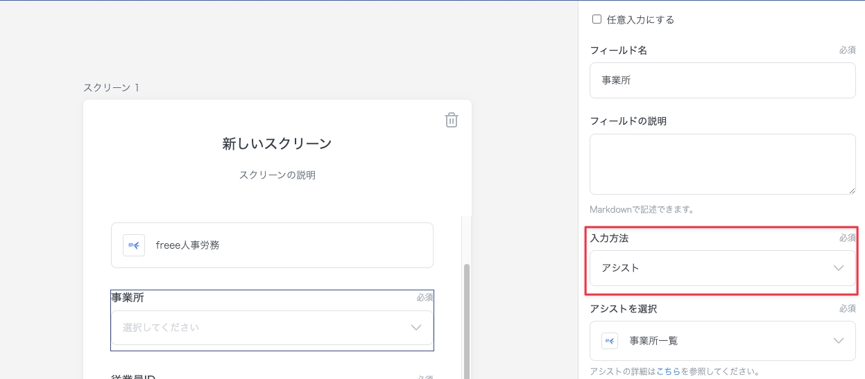 ウィザードの設定に移動します。 「事業所」のエンドユーザー変数の入力方法をアシストにし、事業所一覧を取得できるようにします。