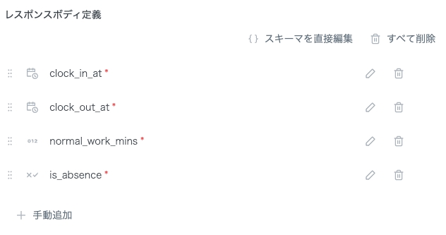また、「レスポンスボディ定義」には以下の設定を行います。