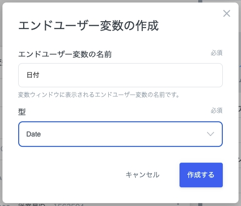 次に、以下のように「日付」のエンドユーザー変数を設定します。型は「Date」を選択します。