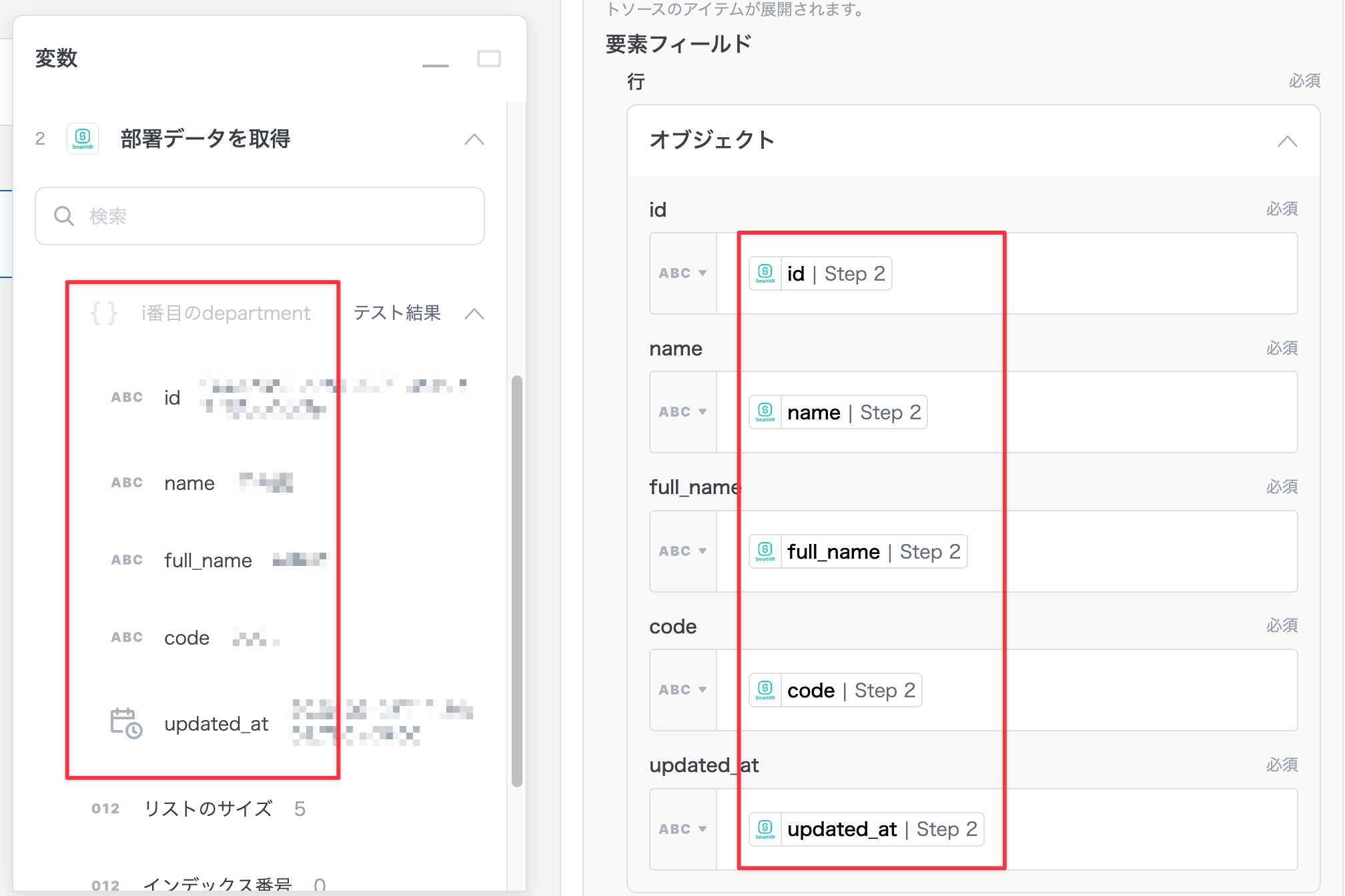 「要素フィールド」は以下の通りに設定します。(「i番目のdepartment」から項目を選択します。)