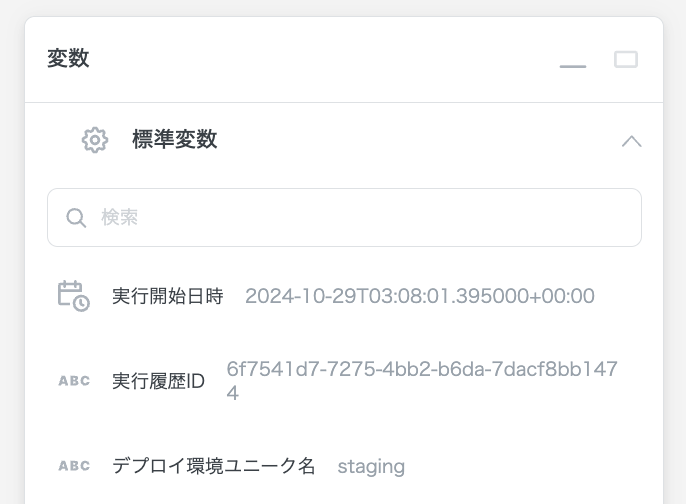 標準変数の「デプロイ環境のユニーク名」を使うことで、デプロイ環境ごとに処理を変えることができます。