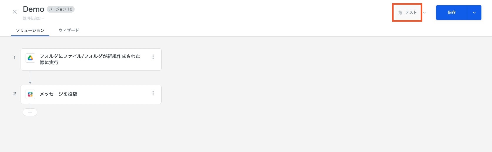ソリューションには、実行の起点となるトリガーが存在します。 ソリューションエディターで設定したトリガーが発火するように、トリガーで設定したサービスのデータを更新するなどして、テストを実行します。