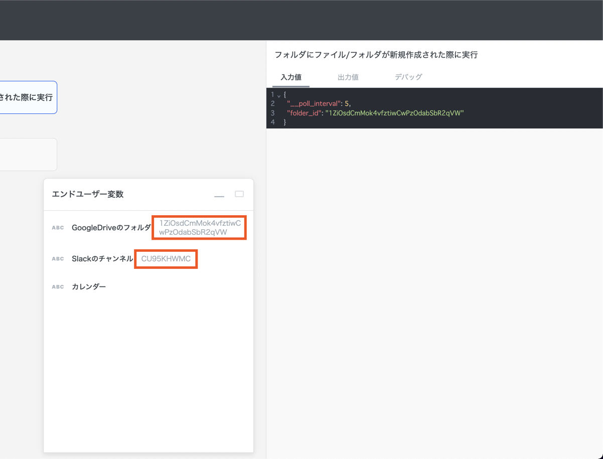 赤枠で囲っている部分は、実際にエンドユーザーから入力され、ソリューションに渡された値です。