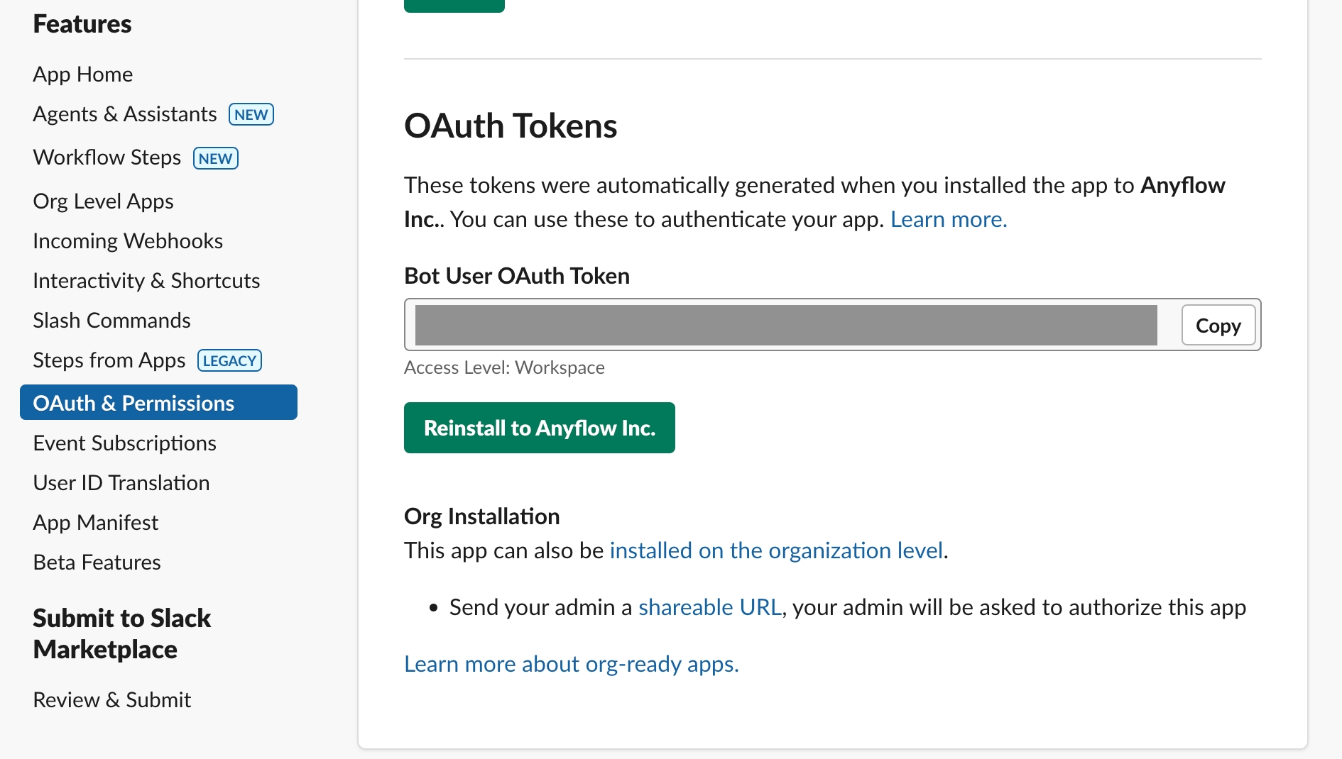 Slack Bot の認証トークンはSlackBotのOAuth Tokens