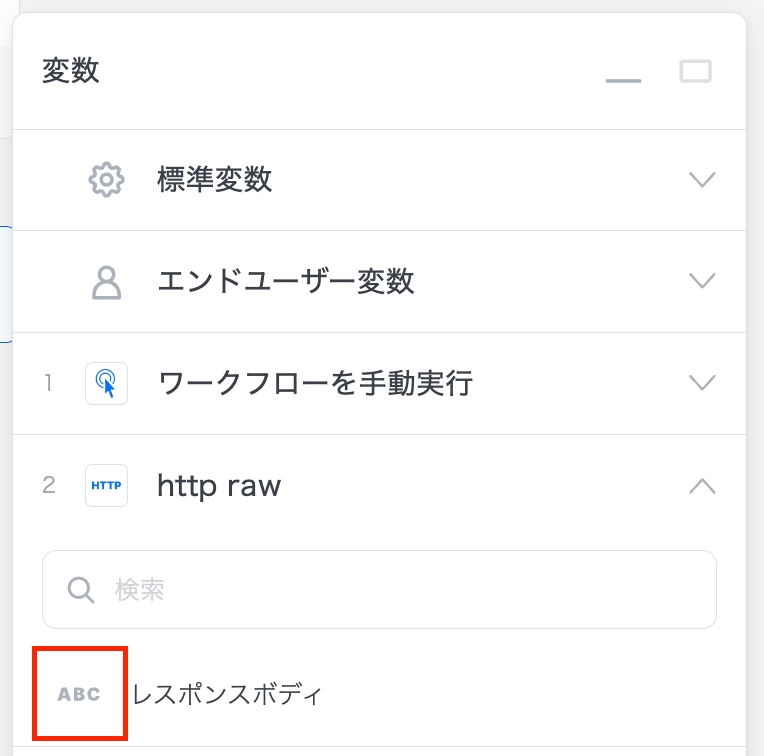 rawのレスポンス実態が文字列ではない場合、は変数アクションを使って適切な型の変数を作成し、そこにrawのレスポンスを格納することで、ソリューション内で正しく扱うことができます。