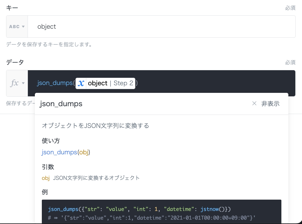 データの入力モードをformulaに変更し、json_dumps