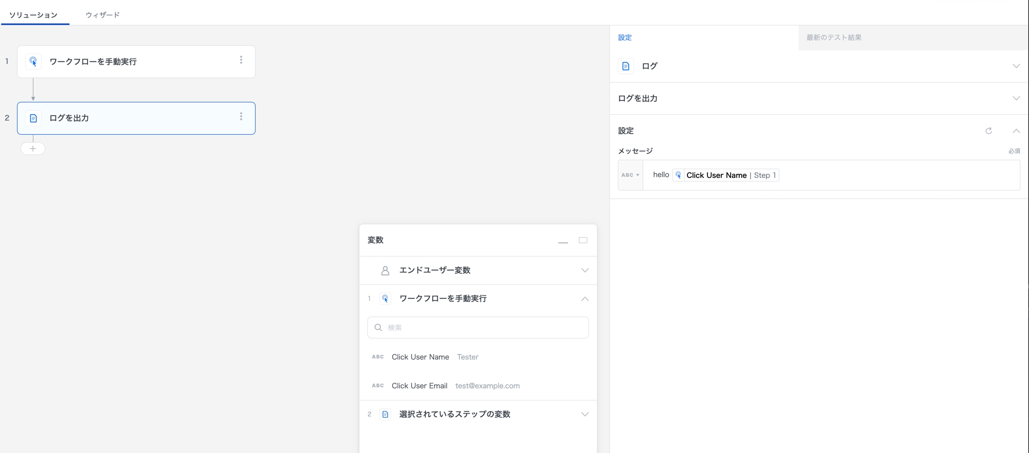 ログアクションで出力されたログは、ウィザード内の「ソリューション実行履歴」にも表示され、エンドユーザーも確認できます。ソリューションの実行履歴の詳細については、こちらを参照してください。