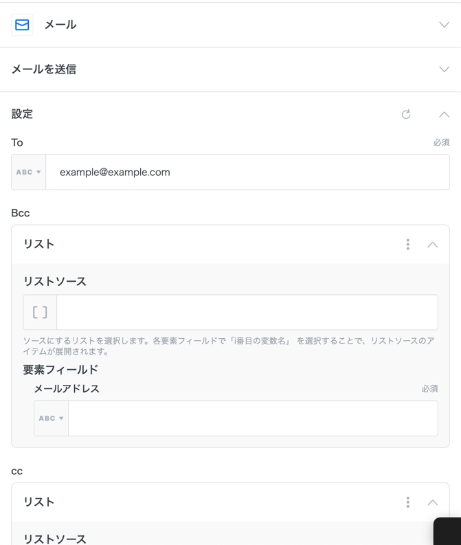メールアドレス形式でないものがTo, CC, BCCに含まれていた場合、アクションはエラーになります。