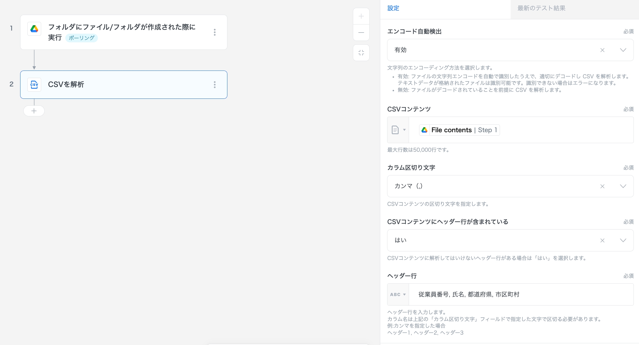 CSVコンテンツに解析してはいけないヘッダー行がある場合は「はい」を選択します。