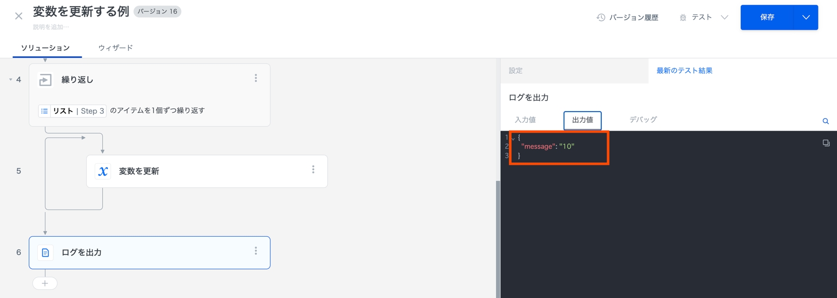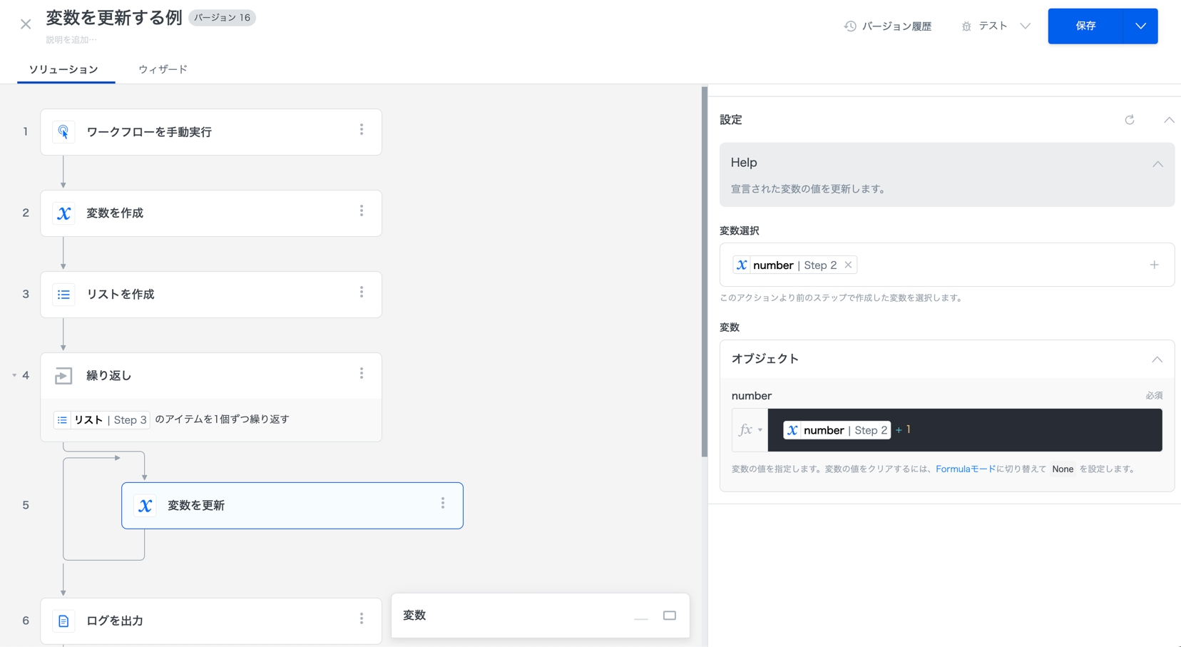 ステップ5で、ステップ2で作成した変数に「+1をする」ように更新しています。