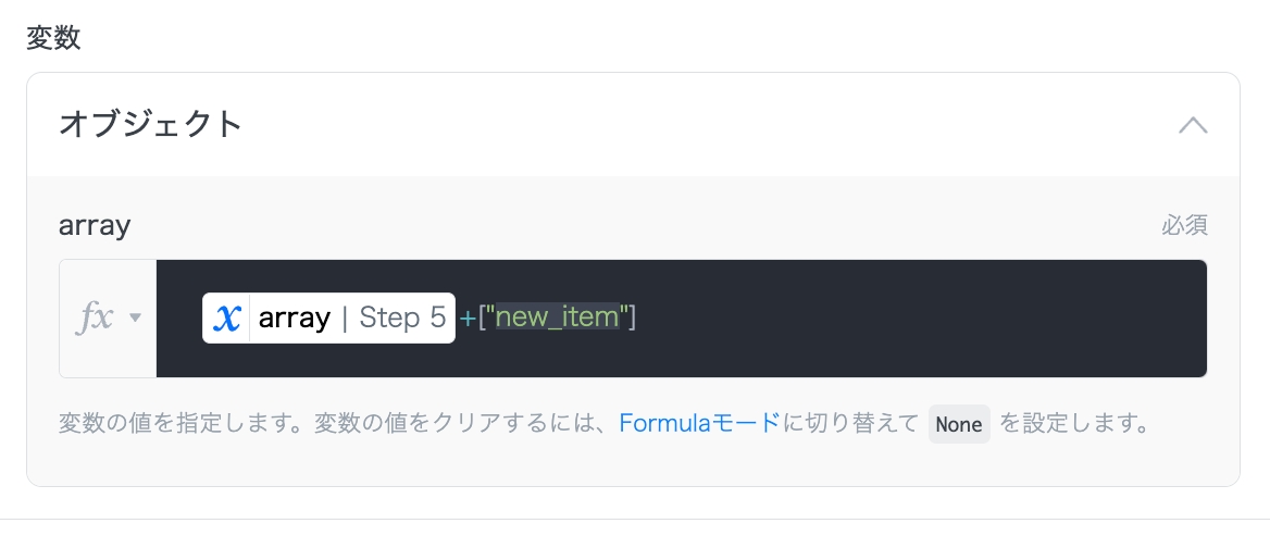 変数を更新アクションを使ってリストに要素を追加するには、以下のような設定を行います。 更新する対象の変数を選択し、変数をFormulaモードに切り替え、以下のようなFormulaを設定します。