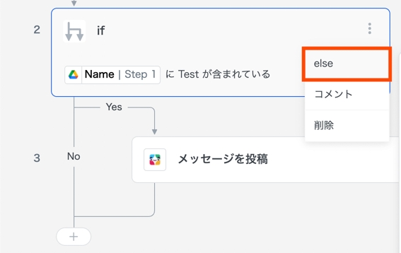 また、ifステップの「︙」をクリックすることで、elseステップを作成することができます。 elseステップは、ifステップの条件が合致しなかった場合に実行されるステップです。