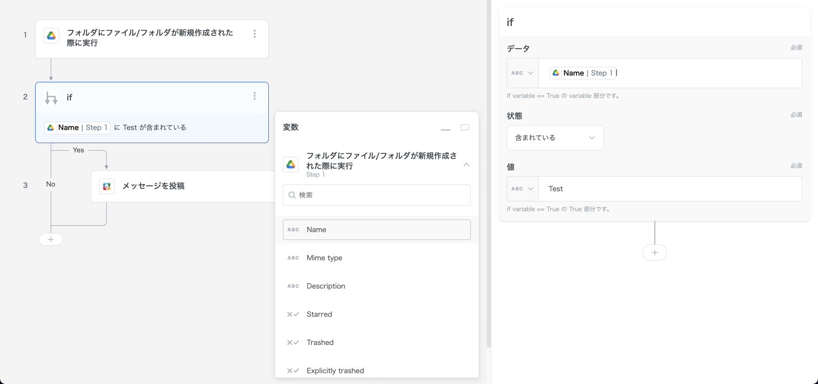 例えば、以下のスクリーンショットは、GoogleDriveのファイル名に Test を含んでいる場合Slackにメッセージを投稿するためにifステップを使用しています。