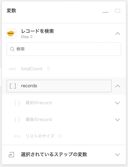 例えば以下のスクリーンショットのステップでは、step番号2のkintoneのレコードを検索 アクションでヒットするレコードの一覧をリストで取得した後、step番号3で繰り返しステップを使いレコードの数だけstep番号4を繰り返しています。