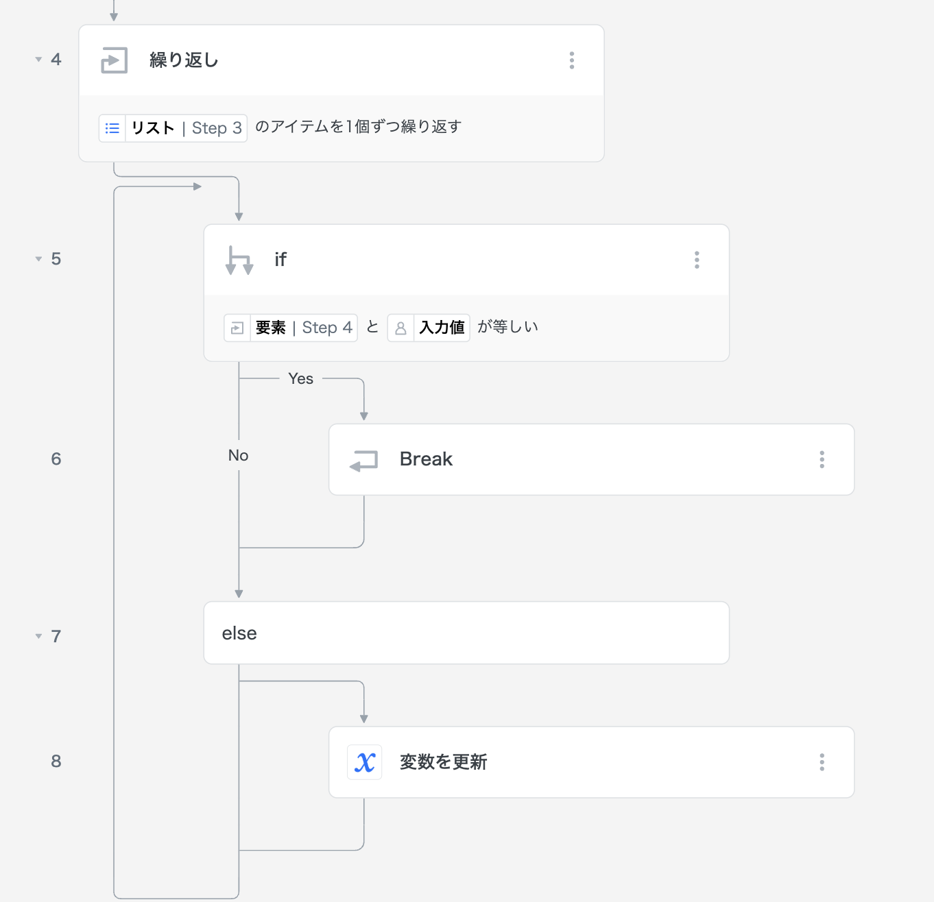 リストを取得し、要素ごとに繰り返しステップを行います。 要素の値がエンドユーザー変数「入力値」と等しい場合はBreakステップにより繰り返し処理を終了し、等しくない場合は変数を更新し、リストの次の要素で処理を繰り返します。