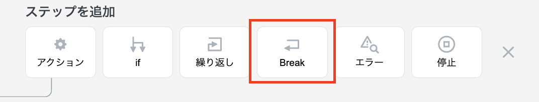 繰り返しステップ内でステップの追加メニューを開くとBreakステップを選択することができます。