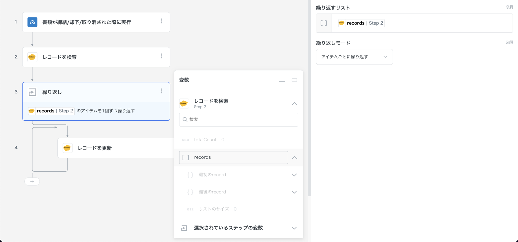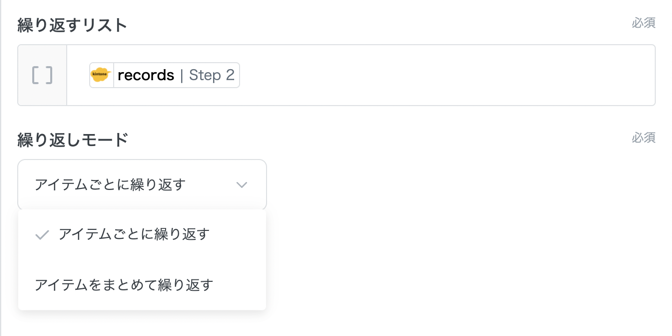 繰り返しステップは、入力フィールドでリスト(例: 複数のkintoneレコード)を受け取り、リストの個数分だけステップを繰り返すものです。