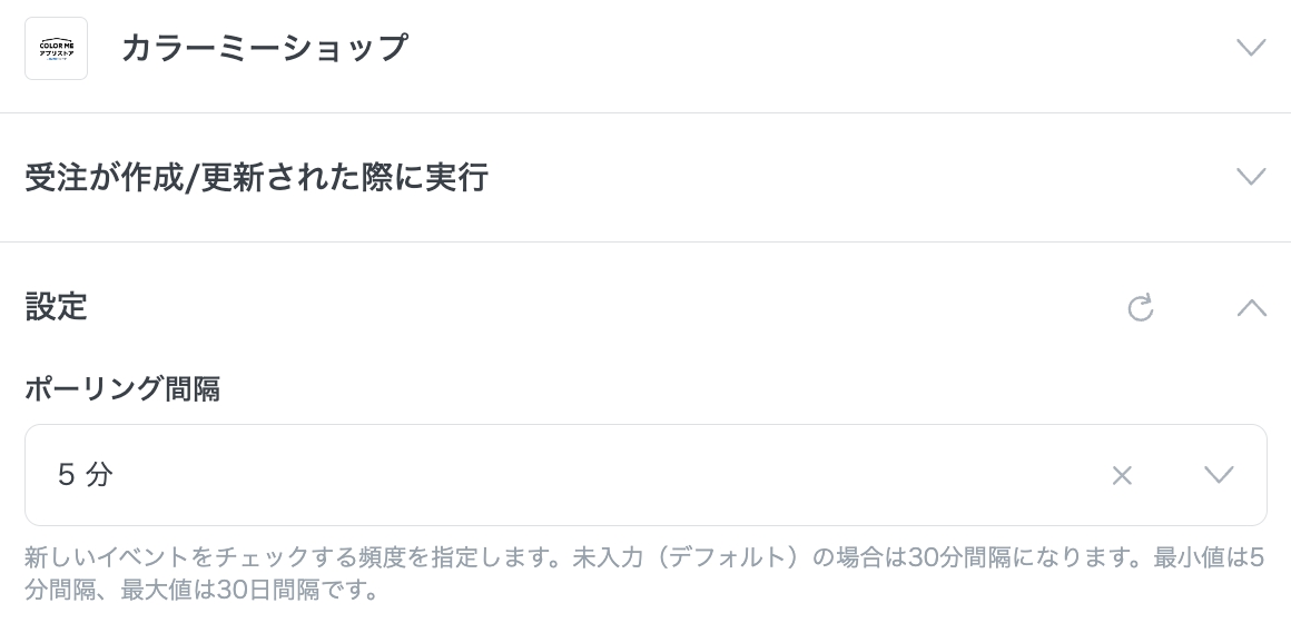 ポーリングトリガーは、新しいイベントが利用可能かどうかを定期的に連携先SaaSに問い合わせることで、新しいイベントの有無を確認します。ポーリングの頻度は最小で5分程度にすることが可能です。