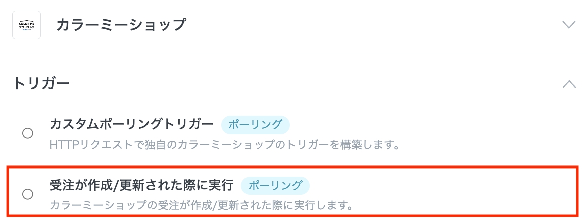 通常のポーリングトリガーは、「〜された際に実行」「〜になったら実行」という形式で表記されています。