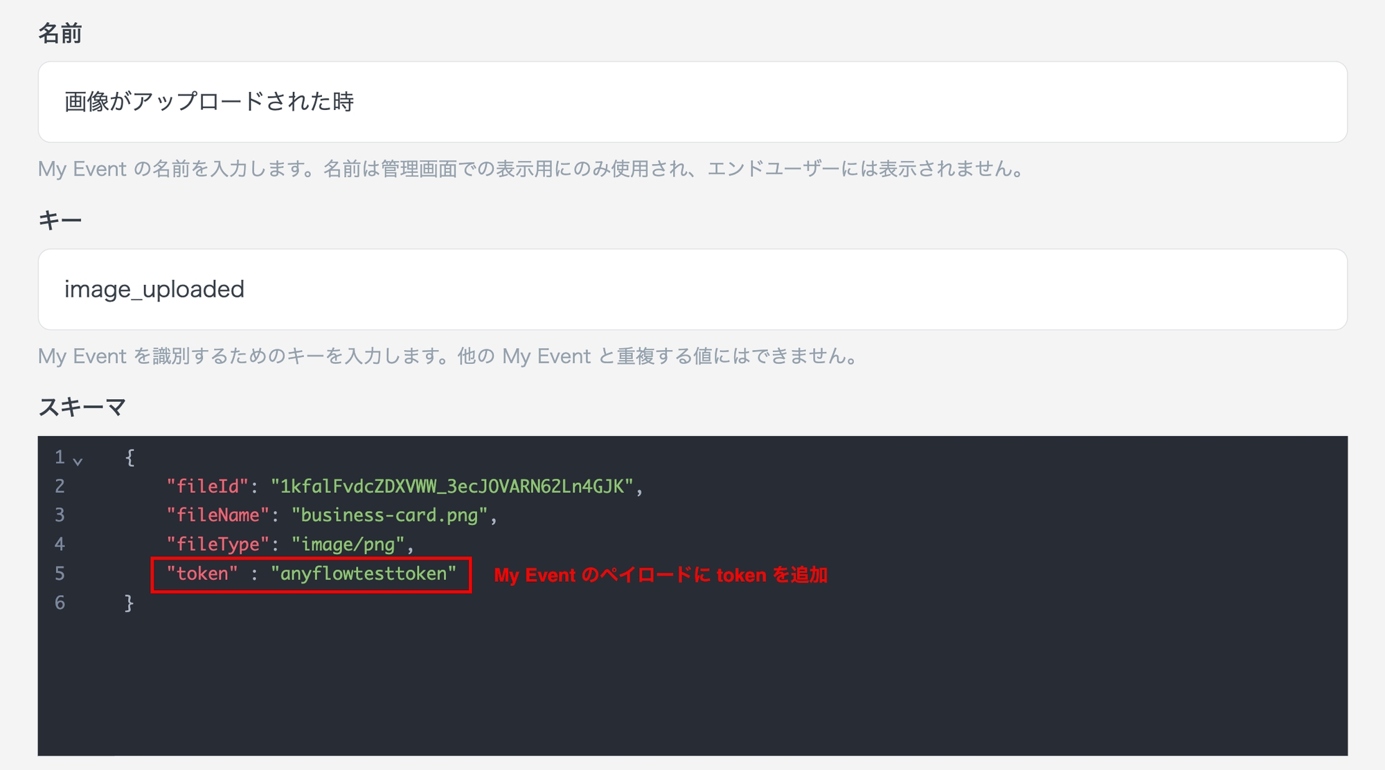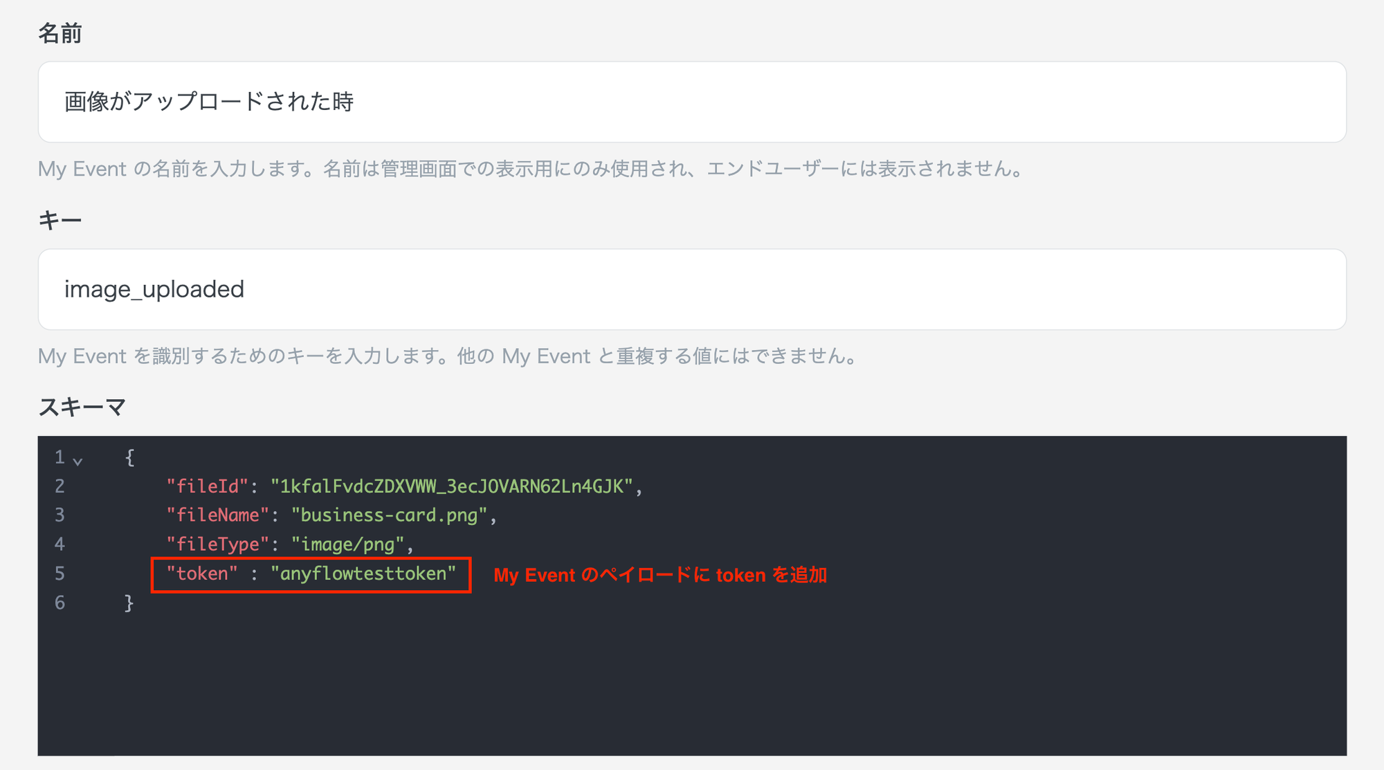 この場合、Tokenの値をエンドユーザー変数で取得するのではなく、My Event のペイロードに含めてしまえば、エンドユーザーの入力は不要になります。