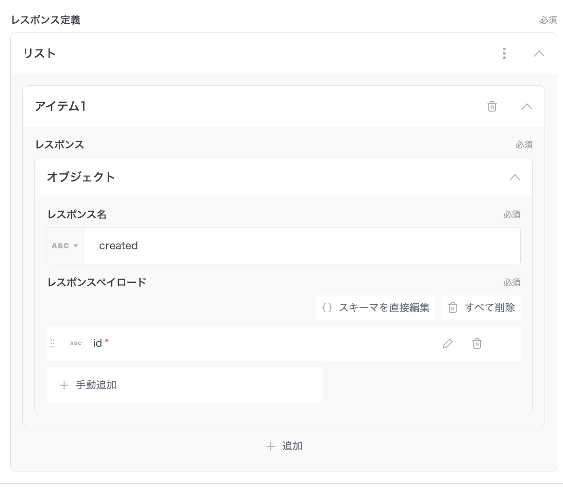 今回は、 レスポンス名:created レスポンスペイロード:id として設定します。