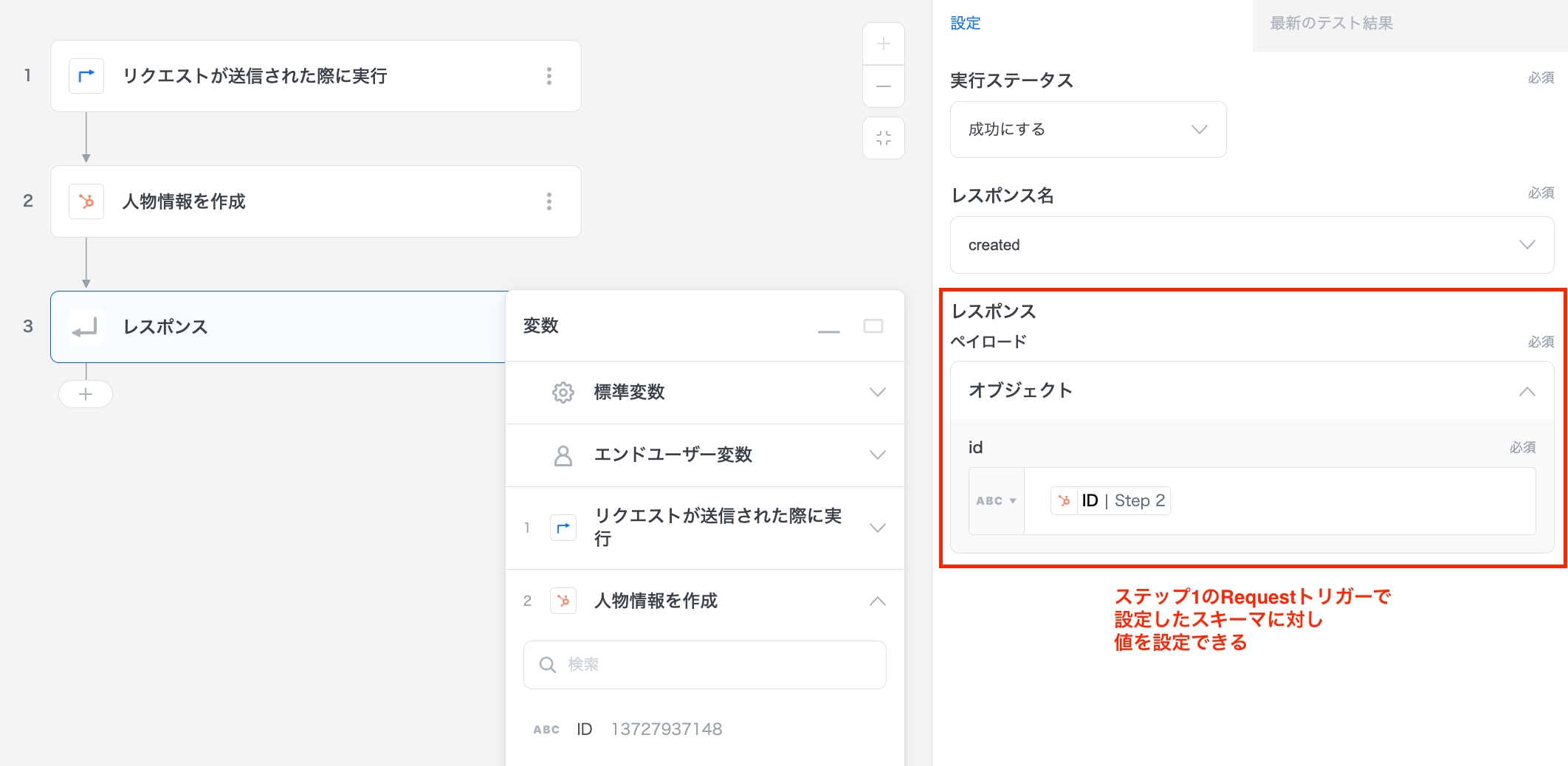 ステップ1のRequestトリガーで作成したスキーマ定義が呼び出され、APIレスポンスとして返却する値を設定できます。