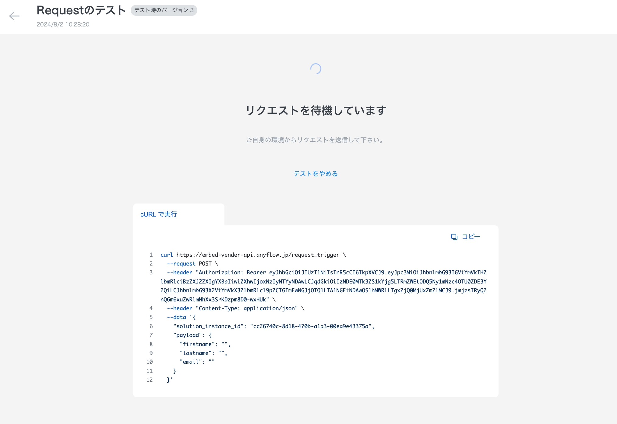 テストモードを起動すると、1度のみリクエストを受け付けます。 リクエストに必要なcURLの例が表示されるので、ペイロードの値を変更しつつご自身の環境から実行してください。
