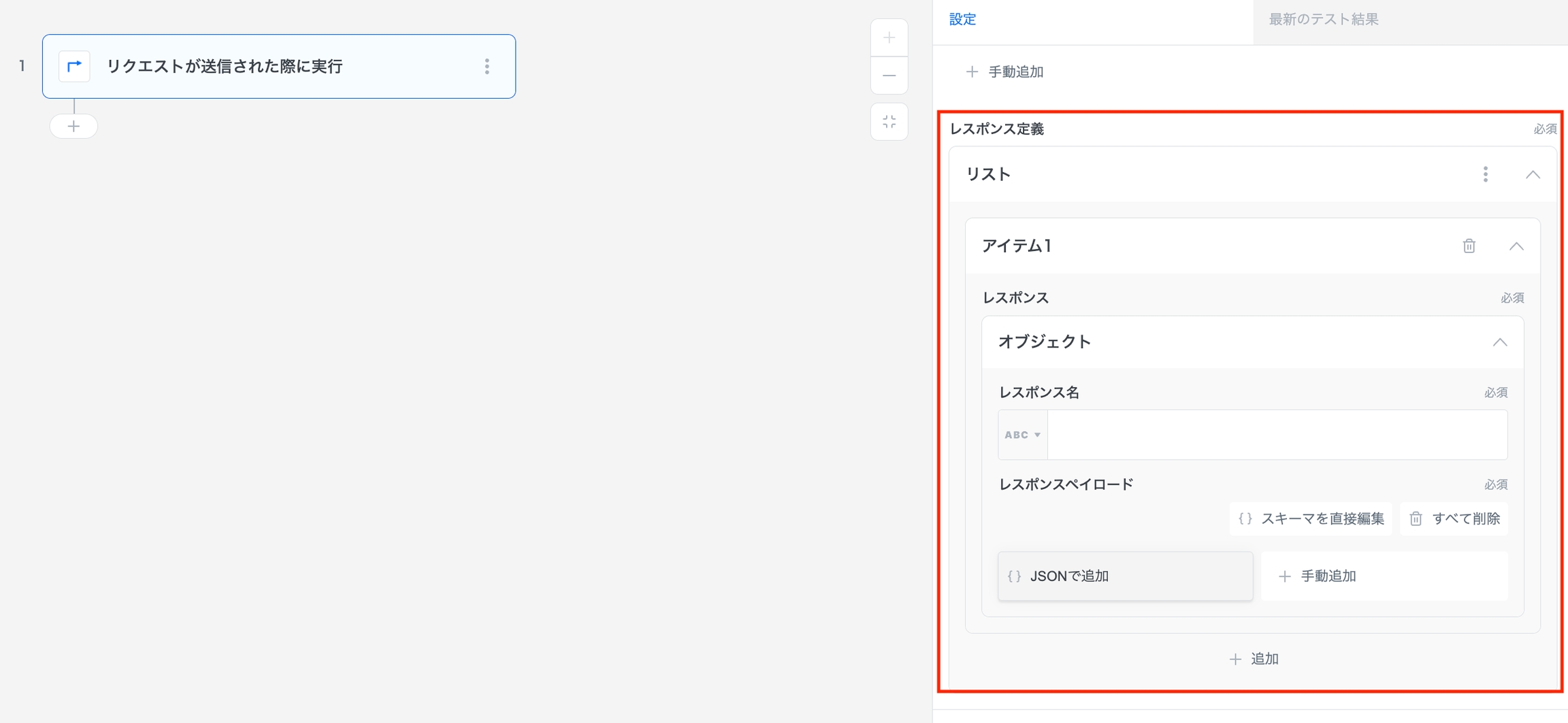 APIレスポンスのペイロードスキーマを定義できます。 ここで設定するのは「スキーマ」のみです。 実際のレスポンスの「値」は後述のResponseステップ で設定します。