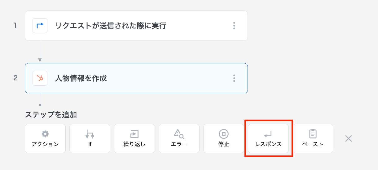 3つ目のステップとしてResponseステップを適用します。 「ステップを追加」 から「レスポンス」を選択します。