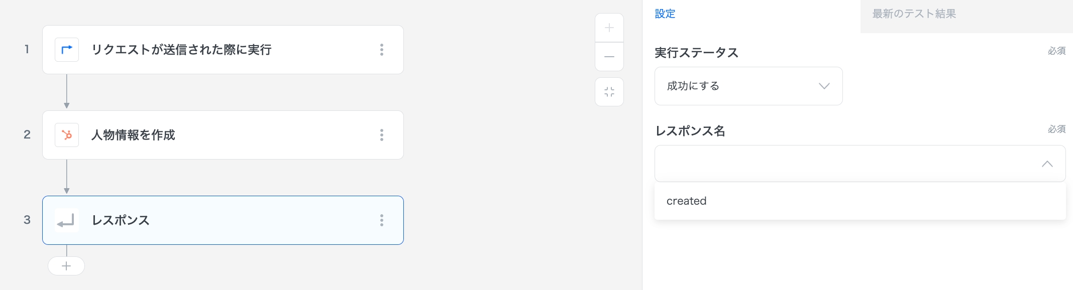 Responseステップの設定にて、レスポンス名から先ほど作成した「created」を選択します。