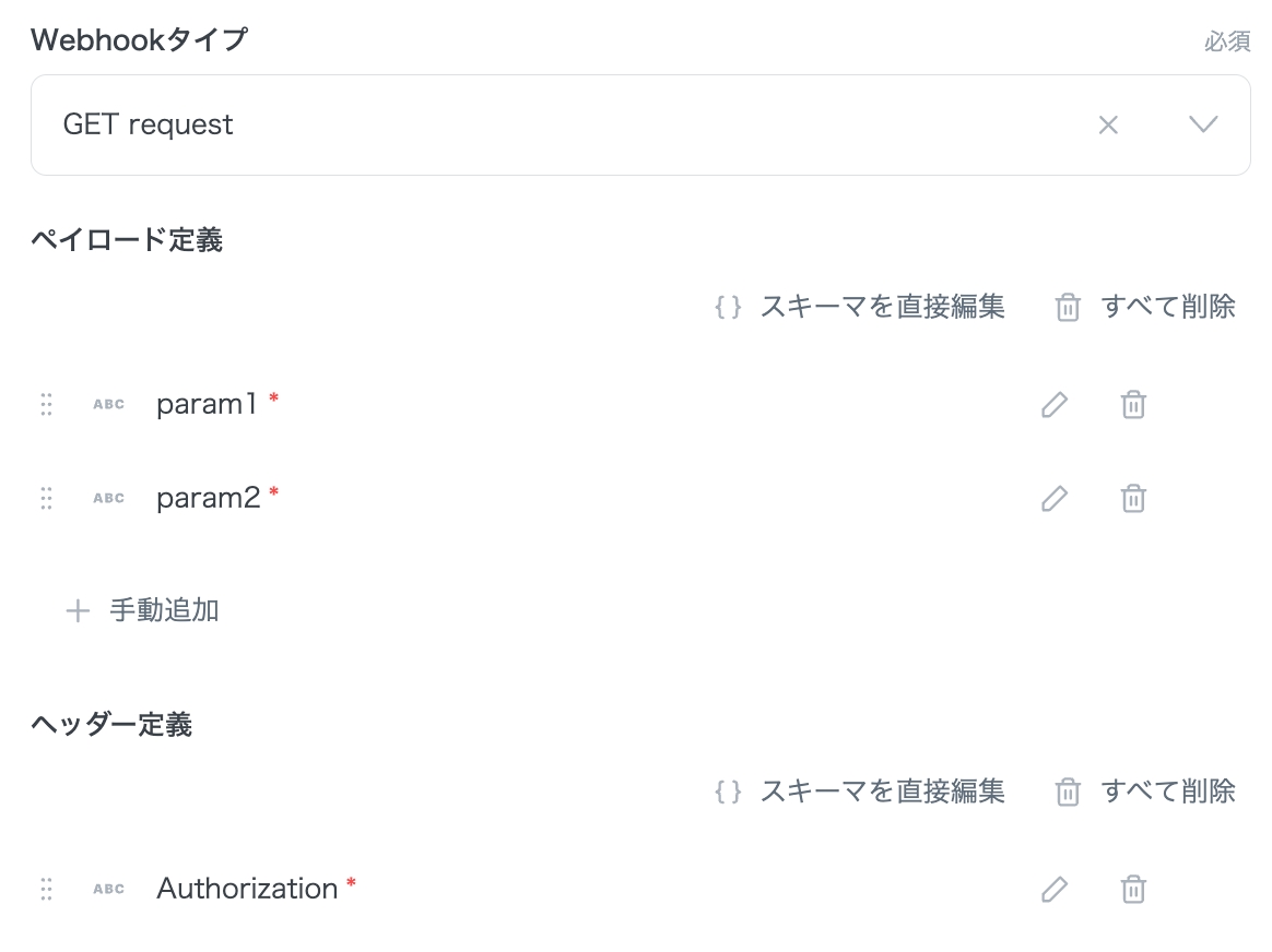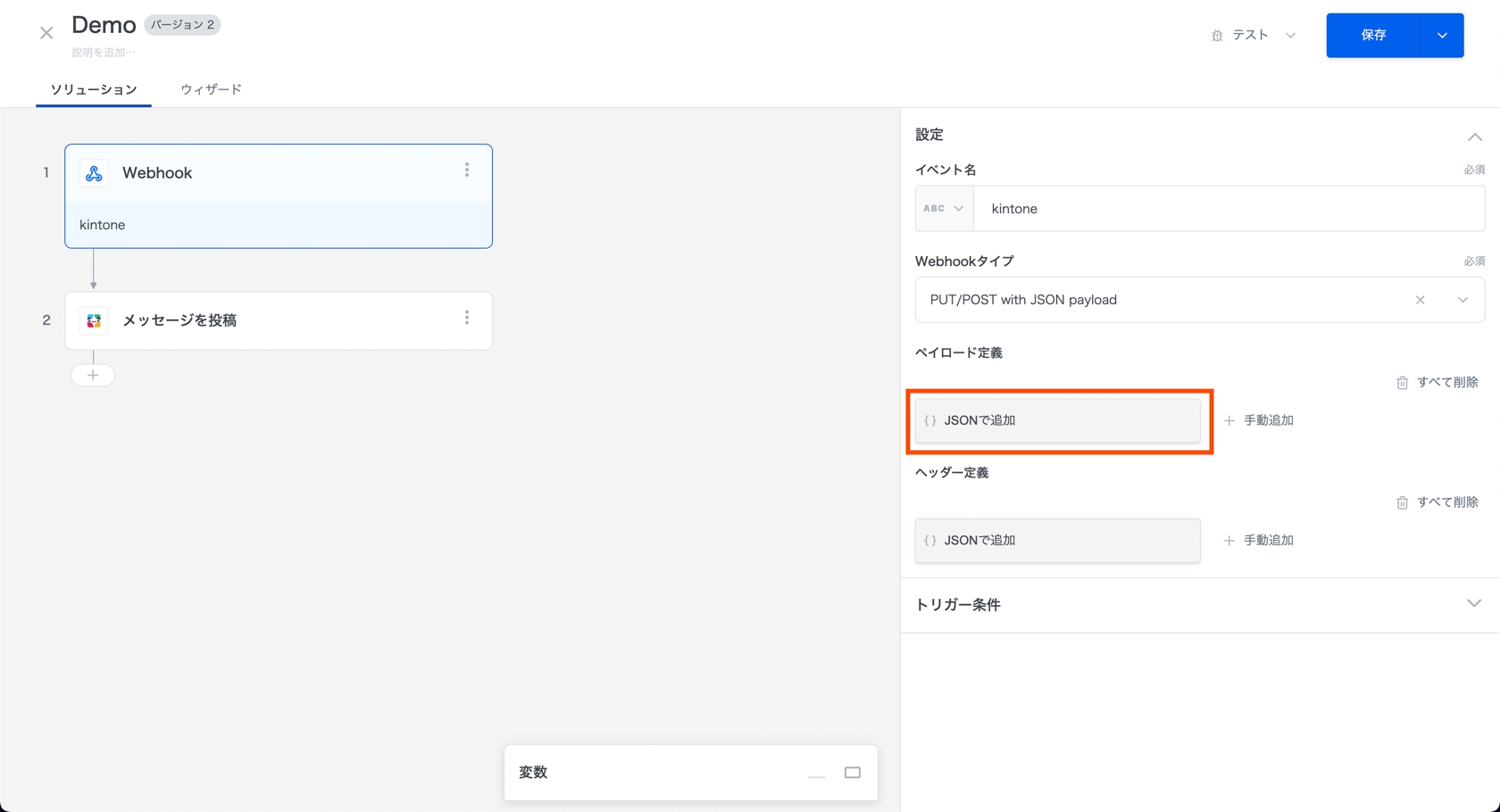 Webhookで送信されてくるペイロードを定義します。 ここで定義した変数が後継のアクション等で変数として利用可能です。
