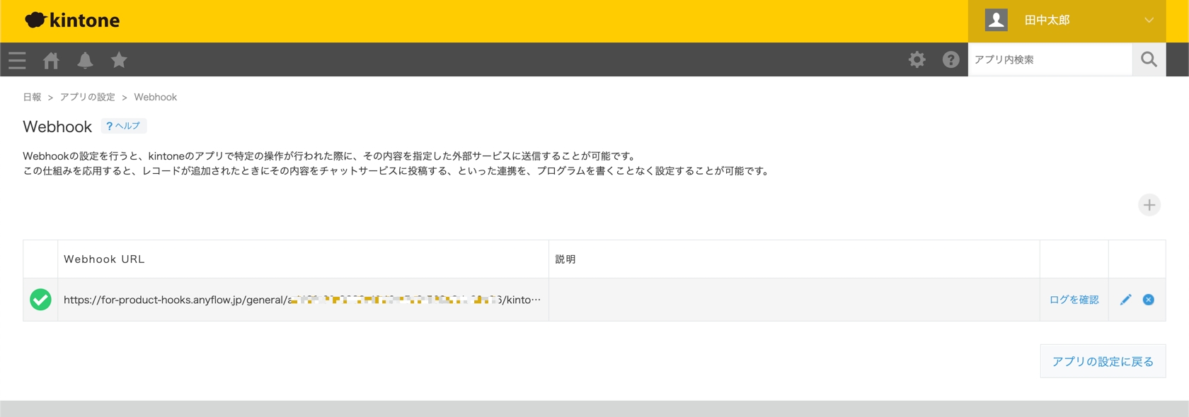 以下のように、kintoneのヘルプページに従ってWebhookが送信されるように設定します。